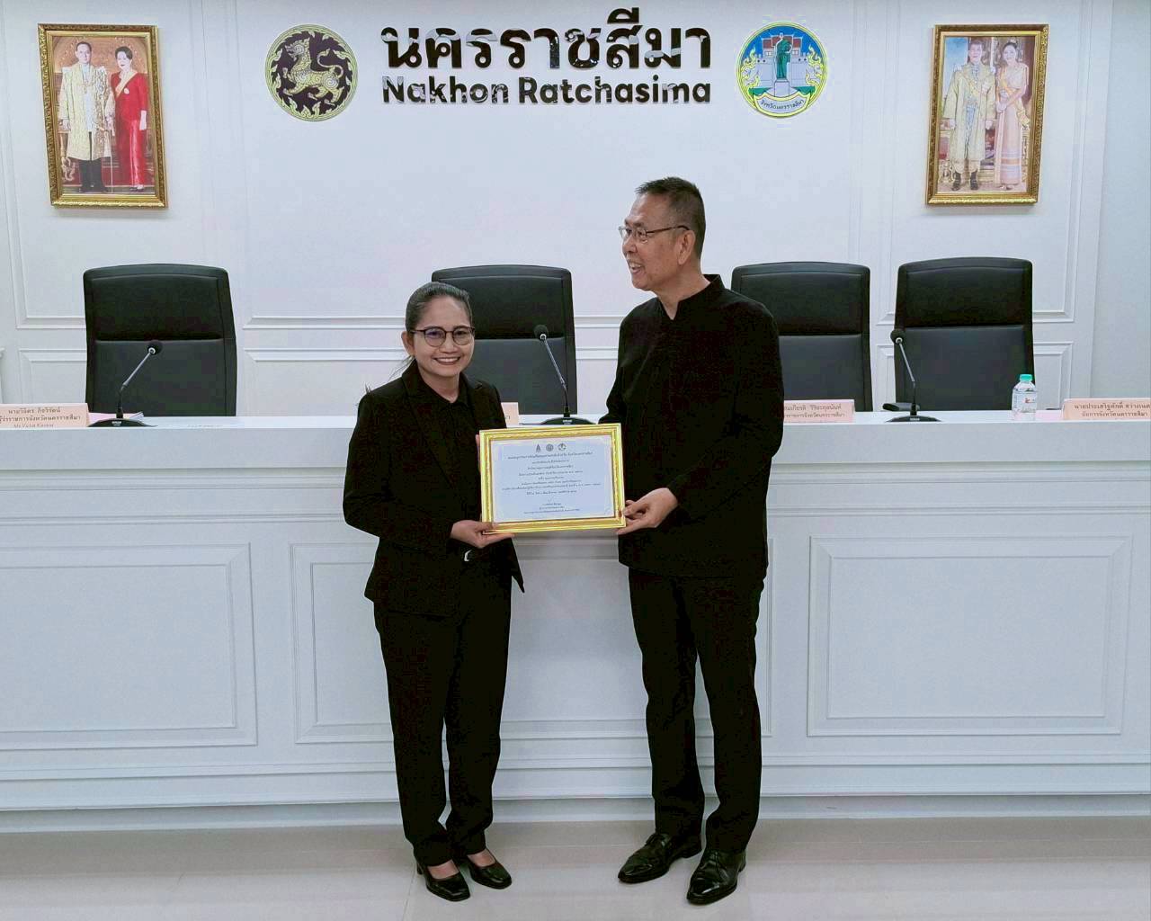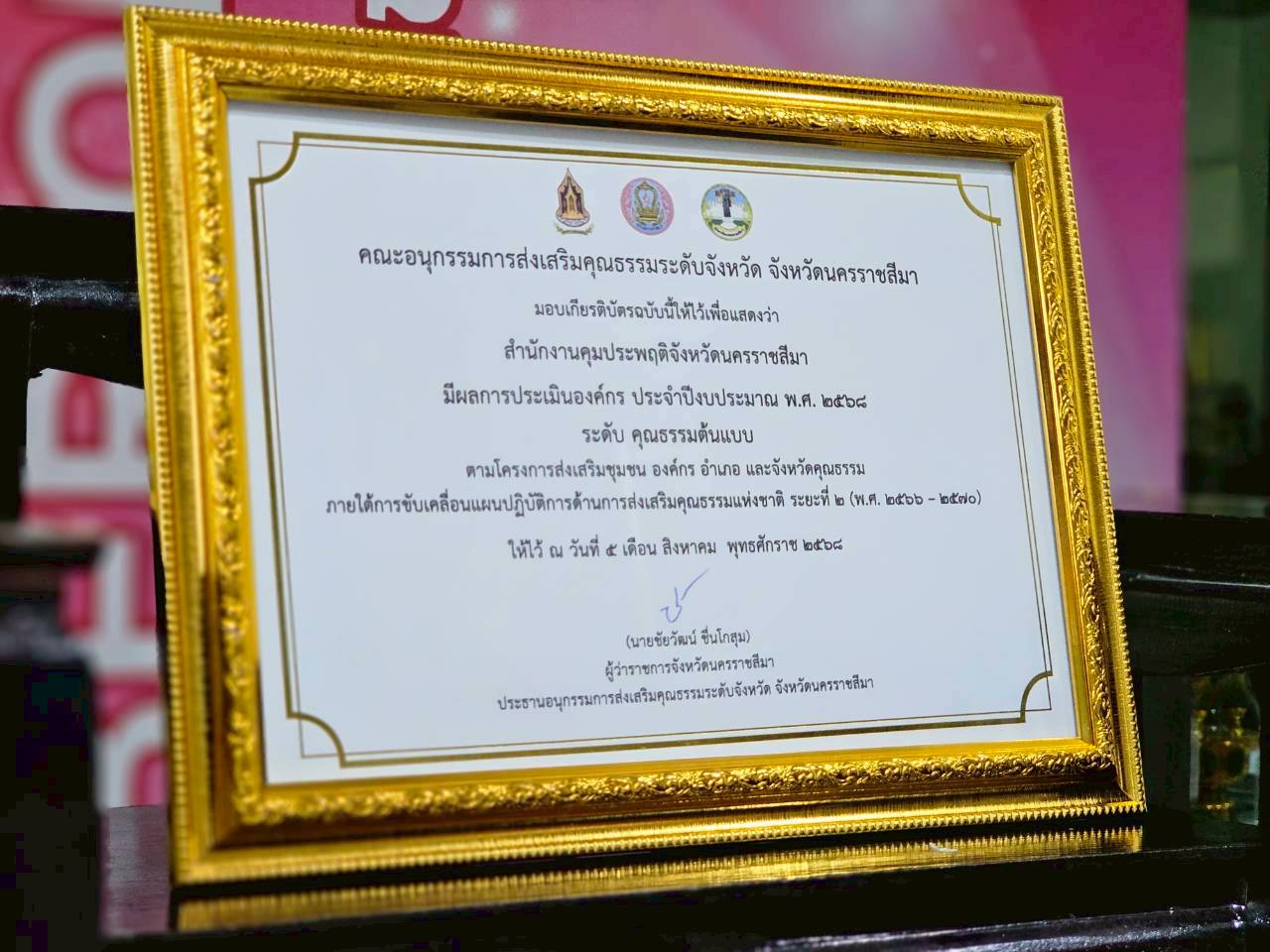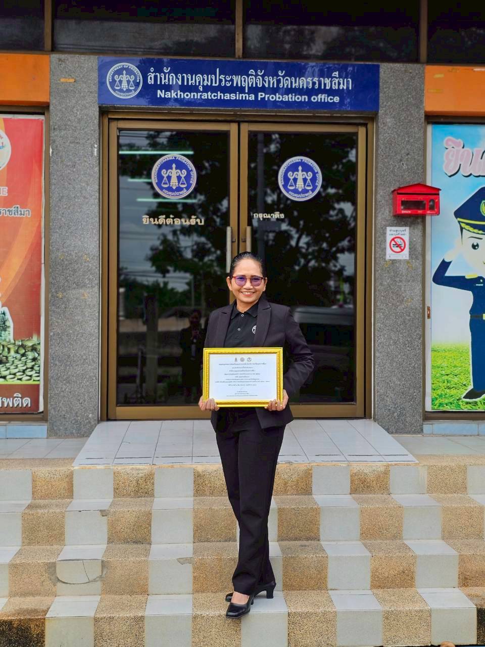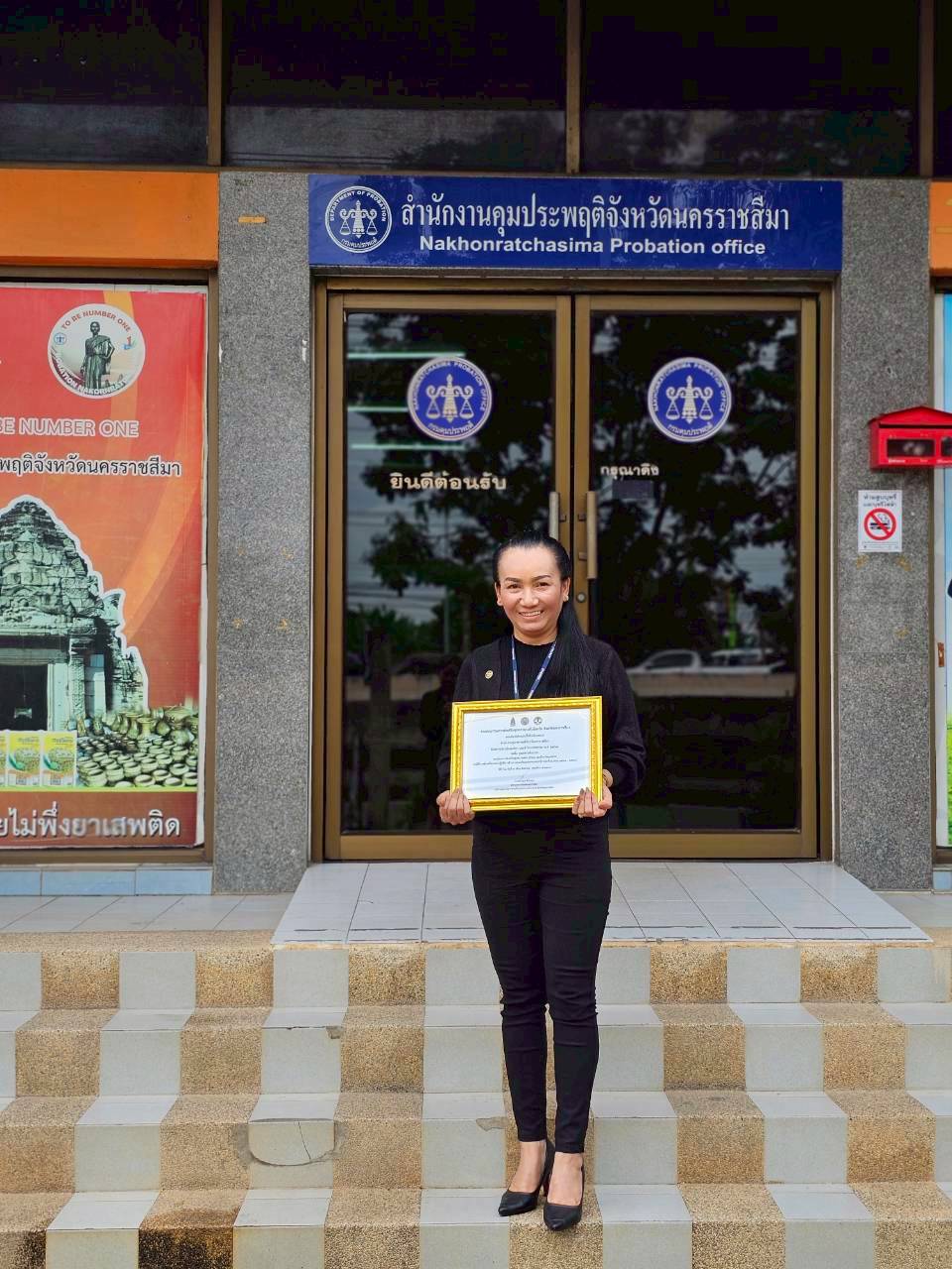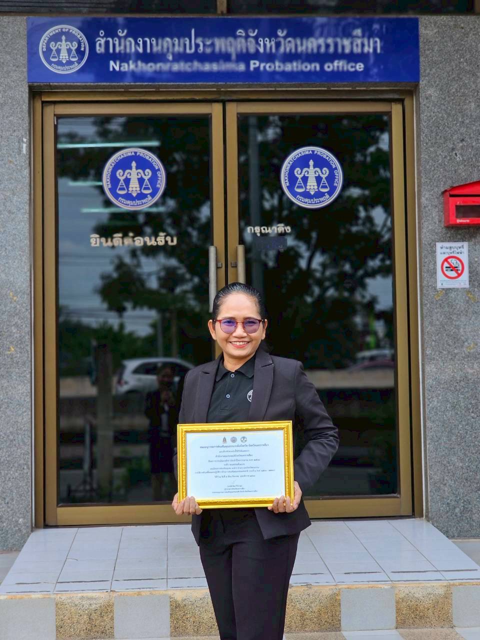 วันพุธที่ 29 ตุลาคม 2568 นางณัฐฐิญา โถสุวรรณ์ พนักงานคุมประพฤติชำนาญการพิเศษ รักษาราชการแทน ผู้อำนวยการสำนักงานคุมประพฤติจังหวัดนครราชสีมา เข้ารับเกียรติบัตร จากนายชัยวัฒน์ ชื่นโกสุม ผู้ว่าราชการจังหวัดนครราชสีมา ประธานคณะอนุกรรมการคุณธรรมจังหวัด จังหวัดนครราชสีมา เนื่องในโอกาสสำนักงานคุมประพฤติจังหวัดนครราชสีมามีผลการประเมินองค์กร ประจำปี งบประมาณ พ.ศ. 2568 ใน "ระดับ คุณธรรมต้นแบบ" ตามโครงการส่งเสริมชุมชน องค์กรอำเภอ และจังหวัดคุณธรรม ภายใต้การขับเคลื่อนแผนปฏิบัติการด้านการส่งเสริมคุณธรรมแห่งชาติระยะที่ 2 (พ.ศ. 2566 - 2570) ณ ศาลากลางจังหวัดนครราชสีมา ตำบลในเมือง อำเภอเมือง จังหวัดนครราชสีมา